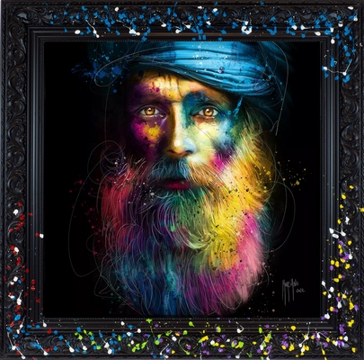 Image Patrice Murciano avec vernis, laminée sur un Médium, encadrée avec une moulure en bois massif, projections* de peintures sur le cadre.